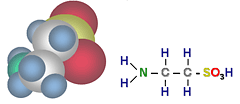 Таурин: H2N – CH2 – CH2 – SO3H (2-аминоэтансульфоновая кислота) Молекулярная масса..……...………………………………….…….125,15 Температура плавления (разложения),°С…...…...…….…….…..321-323 Плотность, г/см3……………………………………………………....1,734 Молекула таурина содержит кислую сульфогруппу SO3H (рКа =1,5) и основную аминогруппу NH2 (рКа = 9,06), изоэлектрическая точка в водных растворах составляет 5,12. В физиологических условиях (рН = 7,4) степень ионизации сульфогруппы составляет 100%, аминогруппы — 96,3%, то есть таурин в таких условиях практически полностью существует в виде цвиттер-иона [1]. Таурин белый бесцветный кристаллический порошок, без запаха; кристаллы–игольчатые, плавится с разложением. Хорошо растворимый в воде (10,5г/100 мл при 25°С, прозрачный бесцветный раствор) и практически нерастворимый в 95% этиловом спирте, эфире, ацетоне и хлороформе; устойчив к кипящим кислотам и даже к царской водке. Это указывает на то, что таурин существует в виде биполярного иона: H2N+—(CH2)2—SO3- [2,3]. Таурин растворяется в крепкой H2SO4 и HNO3. Азотистая кислота при действии на таурин дает изотионовую кислоту. Таурин соединяется с основаниями, давая ряд ее прочных солей. Известны соли натрия, кальция, кадмия, свинца, серебра. Они получаются при растворении основания в растворе таурина. Таурин относится к малотоксичным веществам [3]. Синтез таурина был произведен Кольбе [4], который смешивал измельченный изотионовокислый калий с пятихлористым фосфором. Наиболее употребимый способ получения таурина из бычьей желчи. В промышленности таурин получают из оксирана, нуклеофильно расщепляя гетероцикл действием гидросульфита натрия. 1.1.2 Биологическая роль тауринаТаурин или амидоэтиленсульфоновая кислота C2H7NSO3, название происходит от лат. taurus (бык), был открыт Леопольдом Гмелином в 1826 г. как продукт разложения находящейся в бычьей желчи таурохолевой кислоты. Анализ таурина был произведен Демарсэ, а позднее Редтенбахером, который открыл в нем присутствие серы. Таурин находится в желчи многих животных, в мышцах моллюсков, в легких быка, в печени, селезенке и почках ската [4]. В организме образуется при ферментативном окислении сульфгидрильной группы SH цистеина с участием цистеиндеоксигеназы и последующим декарбоксилированием. Таурин образует в печени конъюгаты с желчными кислотами (ацилируясь ими по аминогруппе ), образовавшиеся конъюгаты (например, таурохолевая и тауродезоксихолевая кислоты) входят в состав желчи, и, будучи поверхностно-активными веществами, способствуют эмульгированию жиров в кишечнике. Таурин является естественным продуктом обмена серосодержащих аминокислот: цистеина, цистеамина, метионина. Таурин – жизненно необходимая сульфоаминокислота, которая была найдена практически у всех видов животных. В растительном мире это вещество не встречается. Исключение составляют красные водоросли. Благоприятное лечебное действие оказывает при кардиоваскулярных заболеваниях, гликозидных интоксикациях, гиперхолестеринемии, эпилепсии, диабете, болезни Альцгеймера, при заболеваниях печени, алкоголизме, цистофиброзе, пострадиационном поражении, ретинопатии. После родов концентрация его в материнском молоке достигает больших значений. Предназначенную природой первую порцию таурина младенец получает с молоком матери. Таурин необходим для нормального развития центральной н