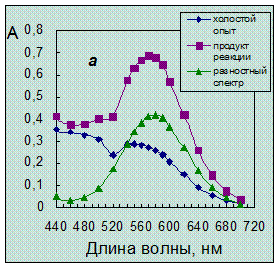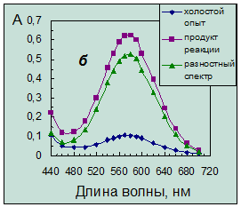 Рис. 3.2. Спектры поглощения продукта нингидриновой реакции. Концентрация таурина 6,4·10-5 моль/л. Условия реакции: а – в присутствии гидриндантина по п.14 (табл. 4.1) (разбавление в 3 раза); б – без гидриндантина при рН 6,2 с добавкой этанола. Анализируя полученные результаты, приведенные в табл. 3.1, можно сделать следующие обобщения: 1. Раствор реагентов Ι - “не работает”, т.к. все реакции с этой смесью не дали окрашенного продукта. 2. ГД повышает устойчивость окраски во времени; без ГД интенсивность окраски раствора ниже и устойчивость снижается. 3. Важна также последовательность добавления веществ для получения окрашенного продукта и дальнейшего анализа, а именно: раствор реагентов, буферный раствор, раствор таурина. 4. Необходимо использовать ацетатный буферный раствор с рН 6,50-6,55, в отличие от 5,3-5,4 по методике [18]. Таким образом, методика анализа с введением ГД имеет следующие недостатки: плохую воспроизводимость результатов, высокий аналитический сигнал холостого опыта (рис. 4.2а) и ограниченную стабильность продукта. В связи с этим был необходим поиск иных условий проведения реакции таурина с нингидрином без введения ГД. Исследование влияния рН в интервале 5,1 – 6,5, создаваемом ацетатным буфером, показало, что синий продукт образуется при рН 6,5 и без ГД, в отличие от капролактама [20]. То есть для проведения нингидриновой реакции с таурином необходимы более высокие значения рН, чем указанные в работе [18]. При этом время нагревания при температуре 80єС пришлось увеличить до 60 минут, вместо 22 мин [20]. Согласно литературным данным на стабильность и интенсивность окраски продукта оказывают влияние добавки спиртов в реакционную смесь. Вводить спирт для стабилизации окраски рекомендуется или после реакции (изопропиловый, амиловый) или во время реакции (этиловый вместе с изобутиловым) [18]. Введение в смесь реагентов этилового спирта и проведение реакции при температуре 100єС в течение 10 минут позволило получить окрашенный продукт сине-фиолетового цвета (рис. 3.2б), устойчивый в течение суток. Порядок введения реактивов не влияет на аналитический сигнал. При этом аналитический сигнал холостого опыта существенно ниже, чем в присутствии ГД (рис. 3.2). При использовании такого смешанного растворителя установлено, что наибольшая величина полезного аналитического сигнала получается при рН 6,2 и приготовлении раствора нингидрина в этилцеллозольве с добавлением спирта в соотношении 1:1. При рН 6,55 в присутствии этанола практически в 2 раза увеличивается оптическая плотность холостого опыта, что нежелательно. На образование окрашенного продукта влияет режим нагревания. Для лучшей повторяемости результатов в присутствии этанола, как показали наблюдения, нагревание следует проводить в вертикально установленных на кипящую водяную баню открытых колбах одинакового калибра. При этом получается окрашенный продукт, сходимость измерений оптической плотности которого (А570) на уровне 0,1 (при концентрации таурина 1,3·10-5 моль/л) при п = 6¸7 характеризуется Sr не превышающим 3%. Таким образом, использование спирта позволило в определенной степени решить поставленные задачи. Установлены наиболее приемлемые условия проведения нингидриновой реакции с таурином: растворитель нингидрина – этилцеллозольв, стабилизатор окраски – этиловый спирт (их соотношение в смеси реаге
