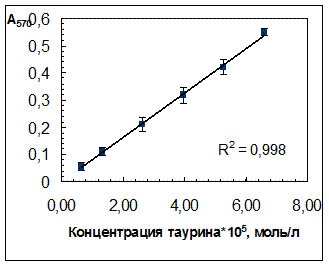 Рис. 4.3. Зависимость оптической плотности продукта нингидриновой реакции от концентрации таурина в растворе. Исходная концентрация таурина в препарате «Тауфон», установленная методом кислотно-основного титрования, составила (0,0414 ± 0,0001) г/мл. Характеристики градуировочной зависимости: b = 8170; a = -0,0023 (не значим); Sb = 174; Sа = 0,007; Cb = 480; y = (8170 ymin = 0,020 (Аmin при 570 нм); Предел обнаружения: сmin= 4,20·10-6 М (5,25·10-4 мг/мл). Следует отметить, что характеристики градуировочной зависимости практически не изменяются в присутствии физраствора. Значение экспериментального молярного коэффициента поглощения, близкое к 8100 М-1·см-1, занимает промежуточное среди указанных в работе [18,20] для продуктов с различными аминопроизводными (от 1,6·103-20·103). Это может быть связано с недостаточно высоким выходом продукта реакции, но стабильность и воспроизводимость окраски полученного в условиях методики красителя свидетельствует о ее применимости для проведения анализа. Таблица 3.2. Метрологические характеристики методики определения таурина с нингидрином в установленных условиях (р = 0,95).