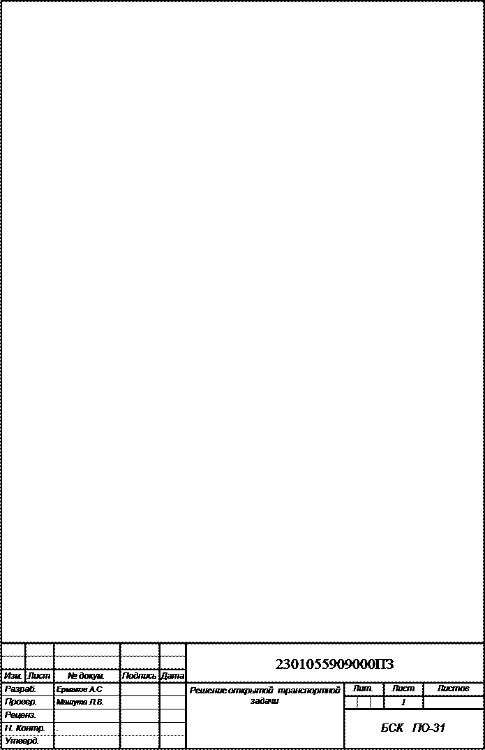 Содержание Введение 2 1. Транспортная задача и методы её решения 4 1.1. Экономико-математическая модель транспортной задачи 4 1.2. Открытая модель транспортной задачи 7 1.3. Методы составления начального опорного плана 9 1.4. Понятие потенциала и цикла 12 1.5. Критерий оптимальности базисного решения транспортной задачи 15 1.6. Распределительный метод решения транспортной задачи 16 2. Разработка и описание алгоритма решения задачи 18 2.1. Содержательная постановка задачи 18 2.2. Построение математической модели задачи 18 2.3. Решение задачи вручную 18 2.4. Решение задачи с помощью Excel 23 Введение Распределительные задачи связаны с распределением ресурсов по работам, которые необходимо выполнить. Задачи этого класса возникают тогда, когда имеющихся в наличии ресурсов не хватает для выполнения каждой работы наиболее эффективным образом. Поэтому целью решения Например затраты обусловленные назначением одной автомашины на некоторый маршрут доставки грузов, не зависят от того какие машины назначены на обслуживание других маршрутов. В то же время при распределении средств между подразделениями фирмы доход от затрат определенного количества денег одним ее подразделением (скажем производством) обычно зависит от того, какие средства будут затрачены другими подразделениями (скажем отделом сбыта). В теории распределения рассматриваются преимущественно задачи с независимыми затратами и доходами. Это объясняется не тем, что такие задачи более важны, а лишь тем, что для них значительно легче строить модели и получать решения. Распределительные задачи с независимыми линейными функциями затрат (или дохода) стали объектом, наиболее интенсивных исследований, в виду того что для их решения были развитые эффективные, итеративные методы линейного программирования. Однако имеются также методы решения некоторых нелинейных распределительных задач, в том числе методы основанные на линейной аппроксимации. Распределение ресурсов для одного периода времени может влиять на распределения ресурсов для последующих периодов, а может не оказывать на них никакого влияния. Если каждое из последовательности распределений не зависит от всех остальных, то такая задача называется статистической