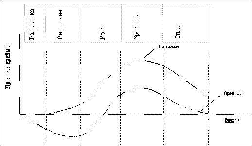 Рис. 1. Жизненный цикл товара. В реальных условиях протяженность отдельных этапов и интенсивность перехода от одного этапа к другому имеют существенные различия в зависимости от специфики товара и рынка. Этап выхода на рынок. На этом этапе фирма организует производство товара и выходит с ним на рынок. Она поставляет лишь ограниченное количество ассортиментных позиций, поскольку рынок не готов к восприятию различных модификаций товара. Потенциальные покупатели еще недостаточно ознакомлены с новым товаром. Поэтому фирма большое значение придает политике продвижения товара на рынок, уделяя особое внимание тем группам покупателей, которые уже готовы совершать покупки. Причем фирма исходит из того, что для товара существуют следующие стадии адаптации на рынке: осознание; интерес; оценка; апробирование; признание. Учитывая наличие таких стадий, фирма, выходя со своим товаром на рынок, пытается его представить так, будто он соответствует всем запросам потенциальных покупателей. Товар передается на их рассмотрение, и если он действительно удовлетворяет определенные потребности покупателей, то в нем появляется необходимость и обеспечивается его продажа. Улучшая качество товара и расширяя число его ассортиментных позиций, и совершенствуя систему распределения, фирма обеспечивает рост продаж товара. При этом цена товара, как правило, остается довольно высокой. Фирма несет убытки или получает незначительную прибыль из-за малых объемов продаж и больших затрат на осуществление политики распределения. Каждая фирма заинтересована в том, чтобы объемы продаж постоянно росли и темпы роста были существенными. Для нее важное значение имеет переход к следующему этапу жизненного цикла товара – этапу роста. Чтобы ускорить такой переход, фирма может, например, улучшить качество товара или увеличить затраты на политику продвижения. Она может также несколько снизить цену на товар или увеличить затраты на осуществление политики распределения. Варьируя одновременно несколькими указанными переменными, фирма может обеспечить достижение тех конечных результатов, которые она хотела достичь на этапе выхода на рынок. Этап роста. Если товар отвечает требованиям покупателей, то он постепенно получает их признание. Многие покупатели совершают повторные покупки. Благодаря рекламе к этим покупателям присоединяются новые покупатели. Объемы продаж значительно растут. Наступает этап роста. К тому времени на рынке увеличивается число конкурентов, что приводит к усилению конкурентной борьбы за позиции на рынке. Поэтому товаропроизводитель должен по-прежнему тратить значительные средства на продвижение товара и одновременно снижать цену на товар. Такие меры могут предпринять лишь финансово самостоятельные фирмы, поэтому конкуренция уменьшается, а цены стабилизируются. В результате объем продаж увеличивается и растет прибыль. Конечно, каждая фирма хочет, чтобы такое положение продолжалось как можно дольше. Для этого она может принять одно или одновременно несколько решений из следующих возможных: выйти на новые сегменты рынка, повысить уровень качества товара, увеличить число ассортиментных позиций товара, снизить цену на товар, обеспечить более высокий уровень политики продвижения товара на рынок и повысить значимость увещевательной 