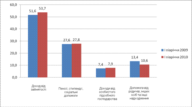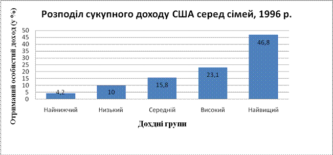 Малюнок дає нам уявлення про те, як виглядає такий розподіл. Тут домогосподарства розподілені на 5 чисельно рівних груп (децелів), висота діограм показує долю сукупного доходу який отримала кожна група. В 1996 р. найбідніші 20% сімей отримали приблизно 4% сукупного особистого доходу – замість 20%, які вони отримали б за рівномірного розподілу доходу. В порівнянні з цим найбільш забеспечені 20% сімей отримали приблизно 47% особистого доходу. Більшість економістів збігаються у поглядах, що в розподілі американських доходів панує значна нерівність. [1, с 85] Грошові доходи є основною складовою загальних доходів і включають: Трудові доходи – заробітна плата, премії, інші винагороди, виплати і допомоги, отримані за основним і додатковими місцями роботи як у грошовій, так і в натуральній формах оплати за виключенням прибуткового податку та інших утримань відповідно чинного законодавства. Доходи від підприємницької діяльності та самозайнятості - особисті доходи від підприємницької, фермерської та самостійної господарської діяльності громадян (тобто без урахування видатків, пов'язаних з цією діяльністю). Джерелом доходу домогосподарства можуть бути надходження від індивідуальної трудової діяльності, виплати за паєм членам кооперативів та дивіденди, якщо в сім'ї є члени акціонерних товариств. Основним джерелом доходів власників промислового, торгового, позичкового і земельного капіталу є відповідно промисловий прибуток, торговий прибуток, позичковий процент і земельна рента. Доходи від власності - отримані дивіденди по акціях та інших цінних паперах, відсотки по вкладах в банківські установи, доходи від здачі в найми нерухомості (житла, гаражів, дач, земельних ділянок тощо). Доходи від продажу нерухомості - грошові доходи, отримані від продажу квартир, дач, гаражів, будинків, частини будинку, земельних ділянок. Доходи від продажу особистого і домашнього майна - грошові доходи, отримані від продажу особистого і домашнього майна (автомобіля, ювелірних прикрас, одягу, меблів тощо) незалежно від вартості їх початкової купівлі. Важливим джерелом формування доходів домогосподарства є особисте допоміжне господарство , яке має місце як в умовах капіталізму, так і в умовах соціалізму. Його ведуть трудящі за умови, що заробітна плата за основним місцем роботи є недостатньою для існування сім'ї. В структурі доходів домогосподарств України питома вага доходів від особистого допоміжного господарства в кінці 90-х років становила 5-10%, що втричі більше у порівнянні з кінцем 80-х років.[8, c 52] Доходи від особистого підсобного господарства включають дві складові: 1) грошові доходи від продажу сільськогосподарської продукції, виробленої в особистому підсобному господарстві та отриманої домогосподарством в порядку самозаготівель; 2) вартість спожитої продукції, отриманої з особистого підсобного господарства та від самозаготівель. При розрахунку цієї статті доходу виключаються матеріальні витрати на виробництво продукції (транспортні витрати, витрати на купівлю кормів, сільськогосподарської техніки та обладнання, насіння, добрива, засобів захисту рослин, ліків для худоби тощо). В цей показник також включається вартість отриманих з особистого підсобного господарства продуктів харчування, алкогольних напоїв та тютюнових виробів, подарованих родича
