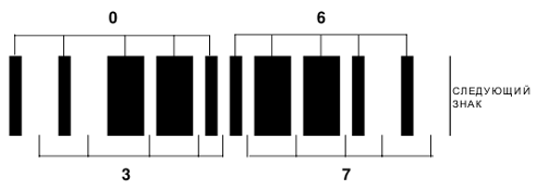На рисунке 1 представлена последовательность элементов: штрихов (тёмных штрихов) и пробелов (светлых штрихов), соответствующая парам знаков цифр «03 и 67».