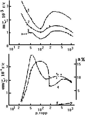 рис.12 Типовая экспериментальная установка показана на рис.12.Оба угольных электрода имели диаметр 6 или 10 мм, подводы к ним охлаждались водой. Анод(4) медленно вращался и перемещался вдоль оси для поддержания заданного межэлектродного расстояния. Медный сборник сажи имел диаметр 52 мм (варианты 30 и 96 мм) и охлаждался водой. Перед напуском рабочего газа производилось обезгаживание электродов пропусканием через них токов 70¸100А при их закорачивании. Собранная со сборника после сеанса горения сажа смешивалась с толуолом при комнатной температуре. Характерное окрашивание раствора появляется уже через несколько секунд, примерно через 1 час концентрация фуллеренов в растворе практически перестаёт увеличиваться, дальнейшая экстракция добавляет менее 1%. Затем толуол выпаривался и экстрат фуллеренов взвешивался. Полученные фуллерены анализировались в масс-спектрометре при нагреве до 300¸400 0 С. При увеличении температуры испарения наблюдался выход более тяжёлых кластеров. Для быстрого анализа использовалось поглощение света в растворе без его взвешивания в видимой (для С70 )и ультрафиолетовой (для С60 ) области. Максимальный выход фуллеренов достигал 7*10-4 г/с»2,5 г/час. На рис. 13-17 приведены результаты оптимизации дуги. Зависимость выхода фуллеренов от давления газа (рис.13) носит сложный характер с двумя максимумами. При низких давлениях р<50 торр с уменьшением давления выход быстро уменьшается из-за увеличения скорости струи и уменьшением времени пролёта углеродного пара до стенки. При больших давлениях Р>500 торр выход снижается с ростом давления из-за уменьшения диффузионной скорости реакций между кластерами. В промежуточной области происходит конкуренция обеих причин, кроме того, добавляется сложная зависимость для теплопередачи. Необходимые высокие давления неона и аргона авторы объясняют условиями образования анодного пятна в этих газах, то есть началом эффективной эрозии анода.