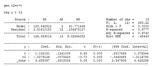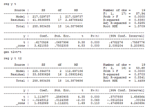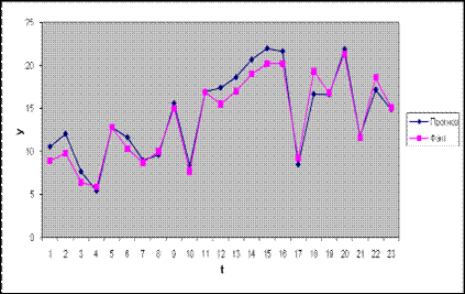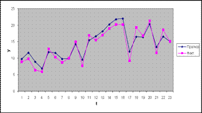 Выравнивание с помощью рядов Фурье дает сумму квадратов ошибок от 200 до 300 (в зависимости от гармоники). Метод экспоненциального сглаживания дает результат получше: для параболического тренда сумма квадратов ошибок колеблется от 36 до 115 (при сумма квадратов ошибок равна 115; при =0,4 сумма квадратов ошибок 36);Для линейной тенденции сумма квадратов ошибок равна 55. Аналитическое выравнивание МНК дает сумму квадратов ошибок, равную 272. Лучше всего описывает тренд метод скользящих средних с параметром n=3. Он дает сумму квадратов ошибок, равную 63.