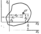 (1) где индекс F у знака интеграла указывает на то, что интегрирование ведется по всей площади сечения. Каждый из интегралов представляет собой сумму произведений, элементарных площадокdF на расстояние до соответствующей оси (х или у). Первый интеграл называется статическим моментом сечения относительно оси х, а второй — относительно оси у. Размерность статического момента см3 . При параллельном переносе осей величины статических моментов меняются. Рассмотрим две пары параллельных осей, x1 ,y1 и x2 , y2 .Пусть расстояние между осями x1 и x2 равно b, а между осями y2 и y2 равно а (рис. 2). Положим, что площадь сечения F и статические моменты относительно осей x1 и y1 , т. е. Sx1 , и Sy1 заданы. Требуется определить Sx2 и Sy2 . Очевидно, х2 = x1 — а, y2 = y1 —b. Искомые статические моменты будут равны или Таким образом, при параллельном переносеосей статический момент меняется на величину, равную произведению площади F на расстояние между осями. Рассмотрим более детально, например, первое из полученных выражений: Величина b может быть любой: как положительной, так и отрицательной. Поэтому ее всегда можно подобрать (причем единственным образом) так, чтобы произведениеbF было равно Sx1 . Тогда статический момент Sx2 , относительно оси x2 обращается в нуль.