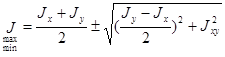 Верхний знак соответствует максимальному моменту инерции, а нижний — минимальному. После того как сечение вычерчено в масштабе и на чертеже показано положение главных осей, нетрудно установить, которой из двух осей соответствует максимальный и которой — минимальный момент инерции. Если сечение имеет ось симметрии, то эта ось всегда будет главной .Центробежный момент инерции части сечения, расположенной по одну сторону от оси, будет равен моменту части, расположенной по другую сторону, но противоположен ему по знаку. Следовательно, Jху = 0 и оси х и у являются главными. |