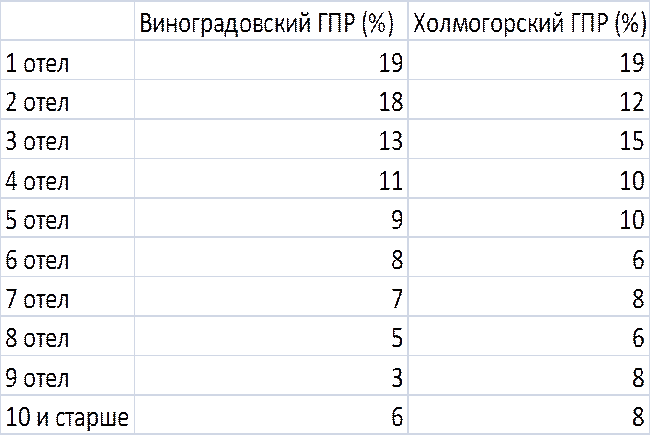 В послевоенное время кормление животных заметно улучшилось, увеличился расход грубых и сочных кормов, в рационе составила всего 10%. Уменьшилось количество концентрированных кормов и в рационе высокопродуктивных коров. Например, корова Смирная сх-6758 (колхоз “Новая жизнь”) при удое 6690 кг с жирностью молока 3,5% за год получила 1647 кг концентрированных кормов, или 24% от её годового кормового рациона. В колхозе “Красный октябрь” корове одинокой сх-6934 при удое 6405 кг с жирностью 3,88% скормлено 1545 кг концентрированных кормов, или 24% от общего количества кормов. Наши наблюдения за животными на племенных фермах бывшего Виноградовского госплемрассадника подтверждают высказывания других животноводов-исследователей о том, что тип кормления и условия содержания скота оказывают существенное влияние на продолжительность его хозяйственного использования. В этих хозяйствах также разводили скот холмогорской породы. Быков-производителей и частично ремонтных телок завозили из Холмогорского госплемрассадника. Следовательно, происхождение и наследственные качества скота Холмогорского и Виноградовского госплемрассадников почти одинаковы. Но тип кормления в этих зонах оказался различным. На племенных фермах Холмогорского госплемрассадника было скормлено: грубых кормов – 22,1 ц, сочных – 33,5 ц, концентратов – 3,0 ц; скот Виногрдовского госплемрассадника получил соответственно: 20,1 ц, 20,5 и 5,5 ц. Таким образом, виноградовцы скармливали животным значительно больше концентрированных кормов и меньше сочных. В результате сроки использования коров в этих хозяйствах оказались различными. Таблица 3 Возраст коров в отелах с 1955 по 1958г.