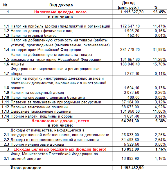 1 Составлено по: постановление Государственной Думы Федерального Собрания Российской Федерации о принятии во втором чтении проекта федерального закона "о Федеральном бюджете на 2001 год", проект федерального закона о Федерального Закона «О Федеральном бюджете на 2001 год». 2) Нет данных о НДС на импорт услуг (туризм, финансовые услуги и т.п.). Фактически импорт услуг, если не весь, то в значительной части, НДС не облагается из-за несовершенства законодательных норм, что ведет к потере бюджетных доходов и к дискриминации отечественных производителей услуг . 3) Низкий доход от акцизов на ввозимые товары, вероятно, означает, что эти акцизы фактически носят запретительный характер. 4) Относительно низкие доходы от 2-х «единых» налогов (на вмененный доход и при упрощенной системе налогообложения), а также от налога на игорный бизнес позволяют ставить вопрос об отмене их федерального статуса: целесообразно сделать их региональными . 5) Слишком малы поступления от налога на покупку валюты: они соответствуют годовому обороту валютного обмена около 5 млрд. долларов США. При том, что по опубликованным оценкам в России имеется как минимум 80 млрд. наличных долларов, получается, что каждый доллар оборачивается 1 раз за 16 лет (!). Реально валютные обороты многократно выше, но при существующем порядке взимания и учета данного налога банки имеют возможность платить его государству лишь с нетто-продаж, а налог, взимаемый с покупателей валюты по промежуточному обороту, в значительной части оставлять себе. Надо менять процедуру уплаты данного налога . Возможно, есть смысл вернуться к предложениям, которые разрабатывались в Совете Федерации при введении данного налога: взимать его однократно, при ввозе наличной валюты в Россию, причем по значительно более высокой ставке, а не по каждой отдельной сделке во внутреннем обороте. Неналоговые доходы составят 64,26 млрд. руб. (5,38% доходов). Из них 26,833 млрд. руб. доходов от использования федерального имущества и 31,498 млрд. руб. от внешнеэкономической деятельности (к ней отнесены таможенные сборы и проценты по выданным Россией кредитам иным странам). Доходы внебюджетных фондов 13,89 млрд. руб. (1,16% всех доходов). При этом из всех целевых бюджетных фондов оставлен лишь один – Минатома РФ. Рассмотрим структурные изменения доходов в сравнении с 2000 г. Начавшийся экономический подъем и проводимая налоговая реформа в совокупности резко изменят структуру доходов бюджета. А) Резко (впятеро) сократятся «доходы внебюджетных фондов» по сравнению с предыдущим годом. Но по существу это означает, во-первых, изменение учетной политики (по доходам), во вторых упразднение некоторой самостоятельности[9] этих фондов. Можно согласиться с тем, что формирование доходов дорожного фонда за счет налогов от выручки, никак не связанной с эксплуатацией дорог, экономически не было обосновано и являлось чрезмерной нагрузкой на экономику. По сути, это означало высший приоритет дорожного хозяйства над иными секторами экономики, что вряд ли оправдано в условиях системного кризиса. В то же время формирование целевых фондов за счет привязки их к отчислениям от некоторых доходов – это вполне здоровый механизм создание заинтересованности органов управления[10] в повышении эффективности своей работы (например налоговых служб). Вызывает сомнения недост