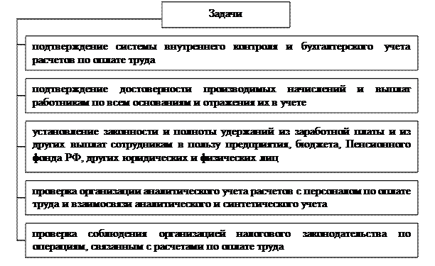 Схема 1.1 «Задачи аудита расчетов по оплате труда» В качестве источников информации используются нормативные и правовые акты, локальные документы организации по труду и его оплате, регистры синтетического и аналитического учета по счетам, бухгалтерская и налоговая отчетность, документы не учетного характера, которые можно