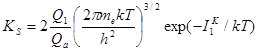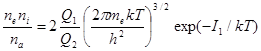 где Q – “внутренняя” статистическая сумма. Поскольку энергия ε0 отсчитывается от общего уровня системы, то, очевидно, разность энергии системы электрон – ион до и после ионизации равна энергии ионизации атома, т.е. Именно эта разность энергий (потенциал ионизации атома) входит в выражение для отношения статистических сумм (1.1.5). Внутренние статистические суммы атомов и ионов можно определить следующим образом [5, с.102]: где квантовые числа l и s определяют орбитальный момент количества движения и спин. При kT<Δε1 (что обычно выполнено для низкотемпературной плазмы(НТП)) члены суммы (1.1.9) очень быстро уменьшаются. При расчетах для атомов в этой сумме можно ограничится двумя членами, для ионов – одним. Электроны внутренней структуры не имеют, поэтому их внутренний статистический вес Q=2, он соответствует двум направлениям спина. Статистическую сумму, связанную с поступательными степенями свободы, определим, основываясь на квазиклассическом приближении квантовой механики [6, с.198]. Размер шестимерной ячейки, соответствующей одному состоянию, находим из соотношения неопределенности Найдем число состояний, приходившихся на весь фазовый объем системы, отвечающий интервалу скоростей Подставляя (1.1.11) в выражение для статистической суммы Заменяя суммирование по скоростям интегрированием, находим Используя полученное выражение для частиц всех сортов, участвующих в реакции (1.1.1), и учитывая (1.1.8), преобразуем (1.1.5) к виду Эта формула, определяющая константу ионизационного равновесия, называется формулой Саха. По аналогии с предыдущим можно получить цепочку уравнений Саха для последовательности степеней ионизации атома, т.е. для реакций где К – кратность ионизации. При этом в формулах Саха