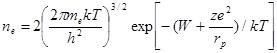 где Q – отношение статистических весов частицы p в зарядовых состояниях z+1 и z; Фz – работа выхода электрона с поверхности заряженной частицы радиуса rp . Вследствие наличия собственных размеров частицы КДФ не могут приблизиться на расстояния r<2rp и поэтому объемный заряд на поверхности (при r=rp +0) КЧ равен плотности электронной компоненты. Подставляя (2.1.11) в (2.1.10), получаем уравнение для среднего зарядового числа z КЧ в плазмозоле. Решив это уравнение относительно z и подставив найденное значение корня в условие электронейтральности среды (2.5), получим среднее значение концентрации электронов в газовой фазе: ne =znp . (2.1.12) Таким образом, уравнения (2.1.10) – (2.1.12) полностью решают вопрос об ионизационном равновесии в плазмозоле идентичных сферических частиц в рамках дебаевского рассмотрения. 2.2. Зависимость электронной концентрации от определяющих параметров плазмы. Гетерогенная плазма, состоящая из двух подсистем: “частичной” – заряженных частиц КДФ и газовой – нейтрального буферного газа с эмитированными КДФ электронами, характеризуется параметрами, на основе которых можно однозначно в рамках той или иной модели рассчитать ее равновесный состав. Кроме термодинамических параметров (T, P, V), характеризующих плазму в целом, каждая из подсистем определяется своими параметрами. Для ансамбля макрочастиц КДФ – это их размер или функция распределения по размерам в полидисперсной системе, работа выхода W вещества частиц. Свойства атомарных частиц в газовой фазе определяются потенциалами ионизации Ij парциальными давлениями компонент Pj , т.е. счетными концентрациями атомарных частиц каждого сорта nAj . Основная цель описания термической ионизации в любой из моделей – построение зависимостей электрофизических параметров системы (плазмы с КДФ) от ее определяющих параметров. При математической формулировке задачи физическая модель обычно сводится к решению соответствующей системы уравнений сохранения и кинетики, записанной для термодинамического равновесия. После преобразований системы ионизационных уравнений приходят в конечном итоге к решению трансцендентного уравнения (см., например (1.2.14)), выражающего функциональную связь между определяющими – исходными параметрами задачи и искомыми (в данном случае электрофизическими). Так, уравнение связывает усредненный заряд дисперсной частицы, а значит, и концентрацию электронов ne =znp , со всеми остальными параметрами, характеризующими плазмозоль, а именно: температурой Т, размером частиц КДФ rp , их концентрацией np (входит в определение D), работой выхода с поверхности материала частиц W. Таким образом, исследование зависимости концентрации электронов ne в равновесном плазмозоле идентичных частиц от определяющих параметров (Т, rp , np , W) можно проводить на основе анализа решения (2.2.1) в пространстве параметров задачи. Общие параметры Т, np характеризуют систему в целом, а rp , W определяют свойства отдельных макрочастиц. Если добавить сюда искомые параметры z и np , то каждая точка (Т, rp , np , W, z, ne ) в пространстве параметров задачи будет определять некоторое состояние ионизации в плазмозоле. Причем реализующимся состояниям соответствуют точки, которые лежат на “поверхности”, задаваемой в пространстве параметров (2.2.1). Это уравнение множеству точек (Т, rp , np , W) ставит в соответствие множество решен