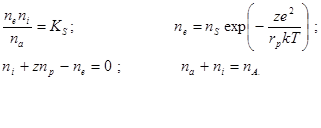 Отметим, что (2.1.4) справедливы только в случае слабой ионизации дисперсных частиц, т.е. при Из уравнения (2.1.1), которое определяет избыточный заряд в окрестности рассматриваемой КЧ и условия, вытекающего из закона сохранения заряда для среды в целом, znp -ne =0 , (2.1.5) находим связь между распределением усредненного электростатического потенциала
