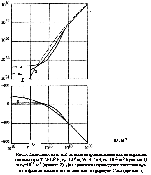 . Штриховая линия 3 определяет ионизацию в чисто газовой плазме с теми же параметрами. Она проведена для наглядности несколько выше, поскольку для nA