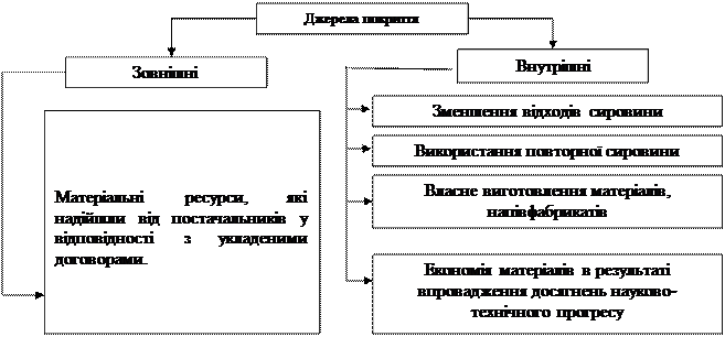 Як видно з таблиці матеріали на базовому підприємстві зменшуються (на загальну суму 416,0 тис. грн.), тобто матеріали будуть скорочуватися до тих пір поки не знизяться до рівня нормативних запасів. Загалом же матеріали зменшилися протягом 2000 року на 416,0 тис. грн. або на 15,83%. Крім цього з таблиці видно, що зменшення матеріалів проходить по майже всіх видах матеріалів, але це характеризує підприємство з позитивної сторони, адже зменшення понаднормативних запасів матеріалів вивільняє значну суму оборотних коштів. Питома вага зменшилася по основним матеріалам на 2,2%, а по допоміжним навпаки зросла на 2,2%. Питома вага основних видів матеріалів теж змінилася: зросла у піску кварцового на 4% і зменшилася по всім іншим видам сумарно на 4%. Є тут і певні особливості зокрема при зменшенні кількості піску кварцового і допоміжних матеріалів, їхня питома вага збільшилася на +4,0% і 2,2% відповідно по кожному з цих видів матеріалів. 3. Аналіз надходження матеріалів Для ефективної роботи підприємства та виробничого процесу потрібно дотримуватися своєчасного забезпечення матеріалами, а також раціонально, ефективно їх використовувати. Основним фактором, який показує забезпеченість підприємства матеріалами є правильність розрахунку поставок матеріалів в відповідності до вимог виробництва. Необхідно забезпечити рівномірне надходження матеріалів до основних цехів і цехів допоміжного виробництва. Забезпечення матеріалами виробництва, їх ефективне і своєчасне використання цілком залежить від матеріально-технічного забезпечення. Тому на базовому підприємстві існує відділ матеріало-технічного постачання, який несе відповідальність за своєчасність надходження матеріалів на склади. При порушенні термінів поставки матеріалів, надходження неякісної сировини може призвести до порушення плану випуску і реалізації товарної продукції. На весь фінансово-економічний штат працівників бухгалтерії базового підприємства ВАТ "ВКП Бучанський завод скловиробів" поставлена задача по перевірці обґрунтованості, перевірка розрахунку встановлених норм і нормативів, які визначені по даним витрат на виробництво минулих періодів, при цьому потрібно враховувати фактичні витрати на виробництво продукції з корегуванням на обсяг продукції, яка запланована на даний період. Для визначення ефективності використання матеріалів здійснюють перевірку відповідності плану поставок потребам виробництва продукції і утворення залишків, тобто виробничих запасів, виходячи з прогресивних норм витрат матеріалів. Для стабільного забезпечення потреб виробництва матеріалами використовується впровадження матеріально-технічних міроприємств по усуненню відхилень, які б спричинили погіршення (зменшення) обсягів виробництва. З джерел покриття виділяють зовнішні і внутрішні джерела покриття (рис 3.1).