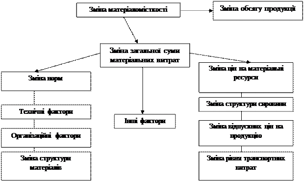 де: DВод. – відхилення по витраті матеріалу на одиницю продукції; Фвип. – фактичний випуск виробів тис. шт; ПВод. – планова витрата матеріалу на один виріб. При вивченні вивчити матеріаломісткості окремих видів продукції та причини зміни її рівня можна застосувати схему факторної системи матеріаломісткості (рис.5.1).