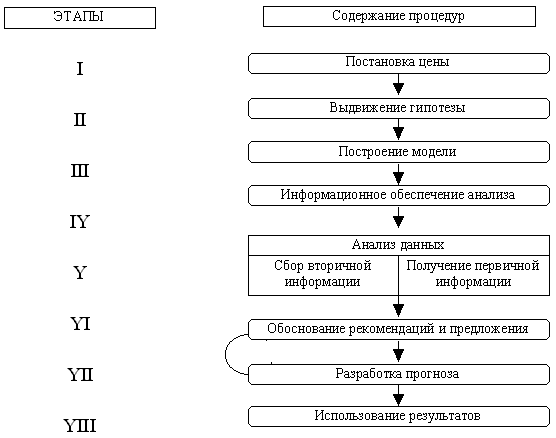 Рис. 1. Общая технология маркетинговых процедур[2] В качестве одного из методов обоснования цели исследования можно предложить так называемый метод "анализа состояния вопроса". Его использование позволяет создать достаточно эффективный механизм начала исследовательской работы в виде обдумывания предложений и заданий по направлениям будущего маркетинга. Суть указанного метода состоит в том, чтобы системно увязать основные проблемы, определяющие содержание статистических исследований, с выдвижением гипотез их разрешения и систематизацией необходимой информации для анализа по ним. Методика работы по анализу состояния вопроса такова. Для обоснования целей и выбора объектов маркетинга рынка труда формируются взаимосвязанные и взаимообусловленные блоки: вопрос (подвопрос); гипотеза (возможные решения); анализ (необходимая информация), с помощью которых цель разрешения поставленной проблемы представляется в виде серии вопросов (обычно в порядке их значимости). Постановка вопросов является центральной задачей этого методы. Каждый основной вопрос для более детального изучения может дробиться на более мелкие подвопросы. В результате складывается двухрядная структура вопросов, которые должны охватить все аспекты в рамках основных направлений исследования. При этот постановку вопросов следует доводить до логического завершения, даже если это требует обдумывания задач, лежащих за пределами рассматриваемой проблемы. 1.2. Гипотезы и модели статистических исследований спрса и предложения рабочей силы Успешное завершение "анализа состояния вопроса" позволяет привести в соответствие отдельные элементы исследований и дает основание считать, что возможно перейти от идеи, которая изложена в сжатой форме, к конкретному проведению исследовательских процедур. Тем самым не только формируются исходные отправные точки для формирования задач, но и определяются необходимые ресурсы распределяются виды работ, устанавливаются сроки их выполнения и формы ответственности. Апробируя метод "анализа состояния вопроса" на региональном рынке труда, исследователи пришли к выводу, что наиболее целесообразным на данном уровне является проведение маркетинга со следующими целями: · оценка особенности региональной модели рынка труда; · изучение конъюнктуры рынка труда и тенденций ее изменения; · определение параметров различных видов рынков (молодежного, женского, регионального и т.п.); · измерение емкости рынка труда; · определение доли различных потоков движения спроса и предложения (по высвобождению, обращающимся в службу занятости, безработным и их категориям, вакансиям и т.п.); · изучение перелива рабочей силы по отраслям народного хозяйства и типам предприятий; · изучение особенностей поведенческих ориентаций различных субъектов на рынке труда; · изучение факторов, обеспечивающих повышение конкурентоспособности субъектов рыночных отношений; · изучение реакции работодателей на изменение качественных характеристик предложения рабочей силы; · изучение процесса востребованности рынком труда работников различных профессий и специальностей (в том числе молодых специалистов); · краткосрочное и долгосрочное прогнозирвоание рынка труда и др. Проведение данных и подобных статистических исследований предпринимается с целью полу