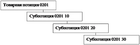 Рис. 4 детализация товарной позиции 0201 При построении товарных позиций и субпозиций в каждой группе применяется своя последовательность признаков, но из всей совокупности можно выделить следующие: степень обработки, назначение, вид материала, из которого изготовлен товар, назначение товара в мировой торговле, сезонность, форма, размеры и т. д. Субпозиция тоже не полностью описывает товар, которому нужно присвоить код: 020714 — «Части тушек домашней птицы», но не понятно, что конкретно имеется в виду — куриные ножки, крылья или шейки? Поэтому товар детализируется дальше, следующий уровень — подсубпозиции, которые имеют свое наименование и десятизначный код товара, получаемый прибавлением четырех знаков к цифровому обозначению субпозиции. Например, 0207146000 — подсубпозиция (ножки куриные мороженные), в которой 020714 обозначают субпозицию. Итак, цифровой десятизначный код товара в соответствии с ТНВЭД России имеет следующую структуру: • два первых знака обозначают группу, в которой находится товар; • первых знака обозначают товарную позицию; • шесть первых — субпозицию; • десять знаков — подсубпозицию.