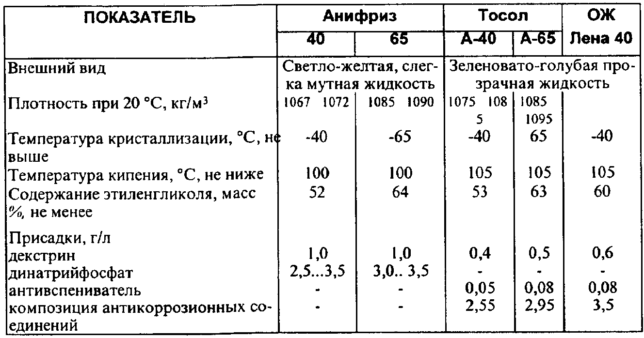Рис. 3 Кривая кристаллизации водно-этиленгликолевой смеси Основные показатели этилен гликоля следующие: • плотность при 20 °С, кг/м3 1,113 • коэффициент рефракции 1,4318 • температура плавления, °С 11,5 • температура кипения, °С 197,4 • коэффициент объемного расширения 0,00062 • удельная теплоемкость при 20°С, кДж/(кг · °С) 2,40 • температура вспышки, °С 122 • температура воспламенения, °С 140 Технический этиленгликоль и жидкости, в которых он содержится, являются весьма токсичными. Поскольку вода и этиленгликоль имеют разную плотность, а при их смешении плотность изменяется пропорционально, определить температуру застывания можно по изменению плотности. В связи с тем, что этиленгликоль оказывает коррозионное действие на металлы, в состав антифризов вводят антикоррозионные присадки. Для предотвращения вспенивания в антифризы добавляют антипенные присадки. При испарении водных растворов этиленгликоля выделяющиеся пары всегда содержат значительно больше воды, чем этиленгликоля. В условиях эксплуатации от испарения теряется практически только вода. При понижении уровня охлаждающей жидкости (в случае отсутствия подтеканий) доливать необходимо дистиллированную воду. Этиленгликолевые жидкости имеют большой коэффициент объемного расширения. При нагревании до рабочей температуры их объем увеличивается на 6...8 %. При застывании этиленгликолевых антифризов объем образующейся кашицеобразной массы увеличивается очень незначительно и размораживания двигателя или радиатора не происходит. Химическая промышленность выпускает несколько марок антифризов на базе этиленгликоля (таблица 2). Первые низкозамерзающие охлаждающие жидкости - антифризы марок 40 и 65. Жидкость марки 40 представляет собой смесь 53 % этиленгликоля и 47% воды и имеет температуру замерзания не выше минус 40 °С. Жидкость марки 65 содержит 66 % этиленгликоля и 34% воды и имеет температуру замерзания не выше минус 65 °С. Таблица 2 - Показатели качества низкозамерзающих охлаждающих жидкостей
