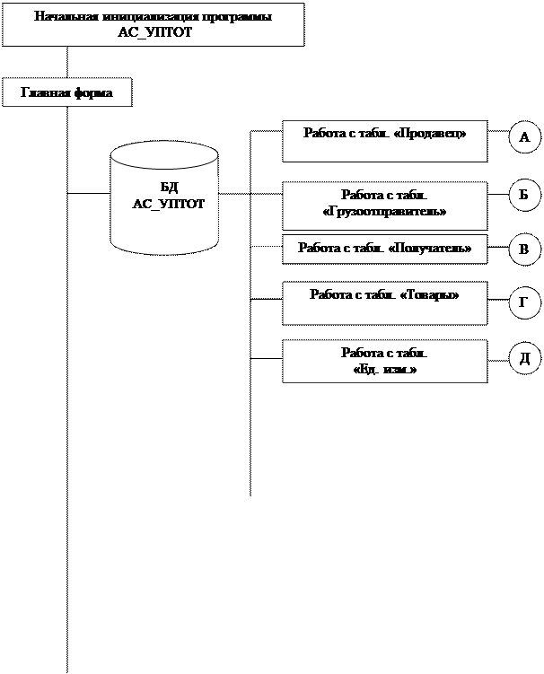 Рисунок 4 (окончание) Программное обеспечение АС_УПТОТ должно быть достаточным для выполнения всех реализуемых функций системы, а также иметь средства организации всех требуемых процессов обработки данных, позволяющих своевременно выполнять все функции во всех режимах функционирования системы. Системное программное обеспечение должно реализовывать программы задач (комплексов задач управления). Для нормального функционирования системы необходимо наличие следующего набора программных средств: - операционная система Windows 98, Me, 2000, NT, XP; - СУБД MS Access (не ниже версии Microsoft Office 2000). 6.2 Информационное обеспечени е Информационное обеспечение АС_УПТОТ включает реляционную БД, которая состоит из 1 – 6 таблиц, в которых описывается логическая структура БД. Таблица 1 – Продавец
