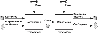 Рисунок 1 . Обобщенная модель стегосистемы. В качестве данных может использоваться любая информация: текст, сообщение, изображение и т. д. В общем же случае целесообразно использовать слово "сообщение", так как сообщением может быть как текст или изображение, так и, например, аудиоданные. Контейнер - любая информация, предназначенная для сокрытия тайных сообщений. Пустой контейнер - контейнер без встроенного сообщения; заполненный контейнер или стегоконтейнер, содержащий встроенную информацию. Встроенное (скрытое) сообщение - сообщение, встраиваемое в контейнер. Стеганографический канал или просто стегоканал - канал передачи стего. Стегоключ или просто ключ - секретный ключ, необходимый для сокрытия информации. В зависимости от количества уровней защиты (например, встраивание предварительно зашифрованного сообщения) в стегосистеме может быть один или несколько стегоключей. По аналогии с криптографией, по типу стегоключа стегосистемы можно подразделить на два типа: · с секретным ключом; · с открытым ключом. В стегосистеме с секретным ключом используется один ключ, который должен быть определен либо до начала обмена секретными сообщениями, либо передан по защищенному каналу. В стегосистеме с открытым ключом для встраивания и извлечения сообщения используются разные ключи, которые различаются таким образом, что с помощью вычислений невозможно вывести один ключ из другого. Поэтому один ключ (открытый) может передаваться свободно по незащищенному каналу связи. Кроме того, данная схема хорошо работает и при взаимном недоверии отправителя и получателя. Требования Любая стегосистема должна отвечать следующим требованиям: · Свойства контейнера должны быть модифицированы, чтобы изменение невозможно было выявить при визуальном контроле. Это требование определяет качество сокрытия внедряемого сообщения: для обеспечения беспрепятственного прохождения стегосообщения по каналу связи оно никоим образом не должно привлечь внимание атакующего. · Стегосообщение должно быть устойчиво к искажениям, в том числе и злонамеренным. В процессе передачи изображение (звук или другой контейнер) может претерпевать различные трансформации: уменьшаться или увеличиваться, преобразовываться в другой формат и т. д. Кроме того, оно может быть сжато, в том числе и с использованием алгоритмов сжатия с потерей данных. · Для сохранения целостности встраиваемого сообщения необходимо использование кода с исправлением ошибки. · Для повышения надежности встраиваемое сообщение должно быть продублировано. Приложения В настоящее время можно выделить три тесно связанных между собой и имеющих одни корни направления приложения стеганографии: сокрытие данных (сообщений), цифровые водяные знаки и заголовки. Сокрытие внедряемых данных, которые в большинстве случаев имеют большой объем, предъявляет серьезные требования к контейнеру: размер контейнера в несколько раз должен превышать размер встраиваемых данных. Цифровые водяные знаки используются для защиты авторских или имущественных прав на цифровые изображения, фотографии или другие оцифрованные произведения искусства. Основными требованиями, которые предъявляются к таким встроенным данным, являются надежность и устойчивость к искажениям. Цифровые водяные знаки имеют небольшой объем, однако,