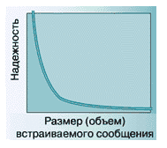 Ограничения Каждое из перечисленных выше приложений требует определенного соотношения между устойчивостью встроенного сообщения к внешним воздействиям (в том числе и стегоанализу) и размером самого встраиваемого сообщения. Для большинства современных методов, используемых для сокрытия сообщения в цифровых контейнерах, имеет место следующая зависимость надежности системы от объема встраиваемых данных (рис. 2).