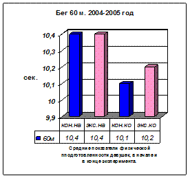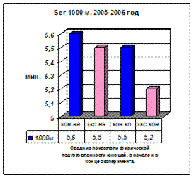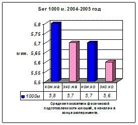 Рис. 7 Рис. 8 В скоростных качествах (в беге на 60 м.): у экспериментальной группы мальчиков произошло улучшение результатов с 9,7 до 9,6, что составило -1,3 %, а у контрольной группы с 10,6 до 10,2, что составило -3 %. У девушек экспериментальной группы с 10,5 до 10,3 -2,1 %, а у контрольной группы с 10,5 до 10,5, что составило -0,3 %. д) в развитии выносливости (в беге на 1000 м) (см. рис. 9, 10).