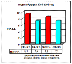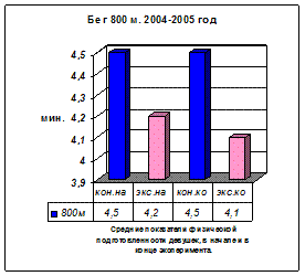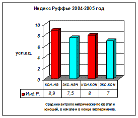 Для решения поставленных задач были намечены следующие методы исследования: 1. Анализ научно-методической литературы. 2. Метод тестирования показателей физической подготовленности. 3. Метод антропометрии. 4. Моделирование. 5. Педагогический эксперимент. 6. Математическая обработка полученных данных. Исследование физической подготовленности проводились следующим образом: 1. Поднимание туловища из положения лежа. Выполняется в положении лежа на спине (на полу гимнастическом мате) за 1 минут. И. п. - лежа, ноги зафиксированы носками под нижней рейкой гимнастической стенки, колени согнуты, руки за головой. По команде «Упражнение начинай!» включают секундомер. Участник поднимается до положения сидя, касается локтями коленей и возвращается в и.п. В этом упражнении учитывается количество правильных повторений. Результат оценивается по таблице. 2. Прыжок в длину с места. На площадке проводят линию и перпендикулярно к ней закрепляют сантиметровую ленту. Учащийся встает около линии, не касаясь ее носками, затем, отводя руки назад, сгибает ноги в коленях и, оттолкнувшись обеими ногами, сделав резкий мах руками вперёд, прыгает вдоль разметки. Расстояние измеряется от линии до пятки сзади стоящей ноги. Даются три попытки, лучший результат идет в зачет. Упражнение требует предварительной подготовки для выработки координации движений руками и ногами. 3. Подтягивание (мальчики – из виса хватом сверху на высокой перекладине). По команде «Упражнение начинай!» производят подтягивание до уровня подбородка и опускание на прямые руки. При выгибании тела, сгибании ног в коленях попытка не засчитывается. Количество правильных выполнений идет в зачет. Сгибание и разгибание рук в упоре лежа (девочки - выполняют отжимание от пола). И.п. - лежа на полу, руки согнуты кисти в упоре на ширине плеч, туловище прямое, носки касаются пола. По команде «Начинай!» участница выпрямляет руки до положения упора; сгибая руки, возвращается в и.п. и т.д. Количество правильно выполненных отжиманий фиксируют в протоколе. 4. Бег – 60 м. 5. Бег – 1000 м (юноши), 800 м (девушки). Исследование физического развития проводились следующим образом: Динамометрия. Измеряется сила мышц кистей – правой и левой. Берется максимальное. Это соотношение в норме у мужчин составляет 65-80%, у женщин - 48-50% от собственного веса. Артериальное давление (АД) - важный показатель здоровья. Верхней границей нормы систолического давления (СД) является 120 мм рт.ст. (для возраста 15-17 лет), диастолического давления (ДД) - 65 мм рт.ст. При физической работе большой мощности СД может повышаться до 240 мм рт.ст. ДД обычно не бывает ниже 50 мм рт.ст. Задержка дыхания на вдохе (проба Штанге). До проведения пробы дважды подсчитывается ЧСС за 30 сек.. Оценивается время задержки дыхания, с зажатым носом на полном вдохе, после трехкратного вдыхания на 3/4 максимальной глубины. При времени задержки дыхания менее 39 сек. проба неудовлетворительна, 40-49 сек. - удовлетворительно, свыше 50 сек. - хорошо. Задержка дыхания на выдохе (проба Генче). Задержка дыхания на выдохе проводится после 3 глубоких вдохов-выдохов. Оценка пробы: менее 34 сек. - плохо, 35-39 сек. - удовлетворительно, свыше 40 сек. - хорошо. Определение ЖЕЛ после нагрузки. Снижение ЖЕЛ на величину более 15% от исходной говорит о повышении давления в легочной артерии. Нагрузкой служат 15 приседаний за 3
