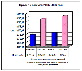 Рис. 3 Рис. 4 В прыжках в длину с места: у экспериментальной группы мальчиков прирост составил с 205,8 до 212,8, что составило 3,4 %, а у контрольной группы с 198,1 до 204,5, что составило 3,2 %. У девушек экспериментальной группы прирост составил с 169,8 до 173,4, что составило 2,1 %, а у контрольной группы с 168,2 до 169,3, что составило 0,6 %. в) в подтягивании на перекладине (мальчики) и в отжимании от пола (девушки) (см. рис. 5, 6).