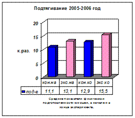 Рис. 19 Рис. 20 В развитии выносливости в беге на 1000м.(ю) – 800м.(д): у экспериментальной группы мальчиков произошло улучшение результатов с 5,7 до 5,6, что составило -3,2 %, а у контрольной группы с 5,8 до 5,7, что составило -1,2 %. У девушек экспериментальной группы произошло улучшение с 4,2 до 4,1 что составило -0,8 %, а у контрольной группы с 4,5 до 4,5, что составило -1,6 %. Прирост результатов показателей физической подготовленности за 2005-2006 год. а) в поднимании туловища из положения, лежа на спине (см. рис. 21, 22).
