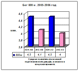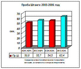 Рис. 49 Рис. 50 Пробы Руффье показали следующие результаты: у экспериментальной группы мальчиков произошло уменьшение с 7,4 до 7,3, что составило -1 %, а у контрольной группы мальчиков с 9,5 до 8,6, что составило -9 %. У девушек экспериментальной группы произошло уменьшение с 9,6 до 8,5, что составило -11 %, а у контрольной группы с 10,1 до 9,4, что составило -7 %. 3.3. Сравнительный анализ показателей физической подготовленности, экспериментальной и контрольной группы После проведенных исследований показателей физической подготовленности, за 2003-2006 год были получены следующие данные. Прирост в экспериментальных группах: за 2003 – 2004 год, 2004 – 2005 год, 2005 – 2006 год, над контрольными группами в % составил. Прирост результатов за 2003 – 2004 год. – Поднимание туловища: у экспериментальной группы мальчиков 8,7 %, а у девушек экспериментальной группы 14,3 %. – В прыжках в длину с места: у экспериментальной группы мальчиков 4,1 %, а у девушек экспериментальной группы 2,4 %. – В силовых видах в подтягивании на перекладине (мальчики): экспериментальной группы 26,1 %, и в отжимании от пола (девушки): экспериментальной группы 8,3 %. – В скоростных качествах (в беге на 60 м.): у экспериментальной группы мальчиков -6 %, а у девушек экспериментальной группы -2,1 %. – В развитии выносливости (в беге на 1000 м.): у экспериментальной группы мальчиков -0,1 %, а у девушек экспериментальной группы -8 %. Прирост результатов за 2004 – 2005 год. – Поднимание туловища: у экспериментальной группы мальчиков 1,7 %, а у девушек экспериментальной группы -14,2 %. – В прыжках в длину с места: у экспериментальной группы мальчиков 0,6 % , а у девушек экспериментальной группы 1 %. – В силовых видах в подтягивании на перекладине (мальчики): экспериментальной группы 3,8 %, и в отжимании от пола девушки экспериментальной группы 2 %. – В скоростных качествах (в беге на 60 м.): у экспериментальной группы мальчиков -3,1 %, а у девушек экспериментальной группы 0,3 %. – В развитии выносливости (в беге на 1000 м.): у экспериментальной группы мальчиков -1,7 %, а у девушек экспериментальной группы -6,8 %. Прирост результатов за 2005 – 2006 год. – Поднимание туловища: у экспериментальной группы мальчиков 6,8 %, а у девушек экспериментальной группы 18,5 %. – В прыжках в длину с места: у экспериментальной группы мальчиков 5,2 % , а у девушек экспериментальной группы 11,3 %. – В силовых видах в подтягивании на перекладине (мальчики): экспериментальной группы 19,7 %, и в отжимании от пола девушки экспериментальной группы 26 %. – В скоростных качествах (в беге на 60 м.): у экспериментальной группы мальчиков -1,7 %, а у девушек экспериментальной группы -3,4 %. – В развитии выносливости (в беге на 1000 м.): у экспериментальной группы мальчиков -4 %, а у девушек экспериментальной группы -9,4 %. 3.4. Сравнительный анализ показателей физического развития, экспериментальной и контрольной группы После проведенных исследований показателей физического развития, за 2004-2006 год были получены следующие данные. Прирост в экспериментальных группах: за 2004 – 2005 год, 2005 – 2006 год, над контрольными группами в % составил. Прирост результатов за 2004 – 2005 год. – Динамометрия: у экспериментальной группы мальчиков пр. 14,7 %, лев. 8,8 %, а у девушек экспериментальной группы пр. 4,1 %, лев. 3,6 %. – Показатели А/Д (С/Д, Д/Д): у экспериментальной группы мальчиков С/Д -0,8 %, Д/Д 9 %, а у девушек экспериментальной группы С/Д 1 %, Д/Д 9 %. – Пробы Штанге: у экспериме