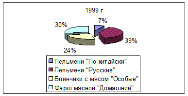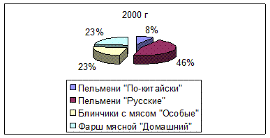 За анализируемый период произошло увеличение объемов выпуска продукции. В частности, объем выпуска пельменей «По-китайски» в 2000 г. увеличился на 47,5%, в 2001 г. – на 49,15%; пельменей «Русские» - в 2000 г. – на 33,61%, в 2001 г. – 46,86%, блинчиков с мясом «Особые» - в 2000 г. – на 16,31%, в 2001 г. – на 25,61. Только по продукции фарш мясной «Домашний» имеет место тенденция к снижению (в 2000 г. темп роста составил 92,61%, в 2001 г. он снизился до 88,34%). Графически структура объема производства продукции ОАО «Импульс» приведена на рис. 2.2.