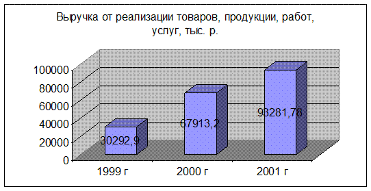 Выручка от реализации за анализируемый период возросла в 2000 г.э на 37620,20 тыс. руб. (или на 124,19%). В 2001 г. её объем увеличился ещё на 25368,58 тыс. руб. (или на 37,35%) по отношению к 2000 г. и на 207,93% по отношению к 2001 г. Таким образом, выручка от реализации за период 1999-2001 гг. увеличилась более чем в 3 раза (темп роста 307,93%). Графически описанное выше можно изобразить следующим образом (рис. 2.3.).