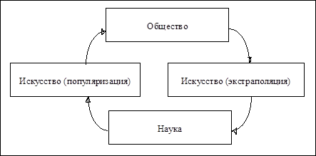 Рисунок 1 Однако такая схема имеет при одном преимуществе - простоте - ряд недостатков: как уже было сказано ранее, наука самодостаточна, поэтому ее связь с обществом напрямую сильно затруднена и возможна только с небольшим количеством людей, в тоже время существует необходимость обеспечить знакомство широких масс общественности с последними достижениями научной мысли и наоборот, посвятить научную элиту, которая вращается в своих кругах, насчет настроений и мыслей общественности. Эту задачу как раз и выполняет искусство, в частности литература, если брать еще уже, то научная фантастика. Отсюда мы получаем схему, которая изображена на рисунке 2.