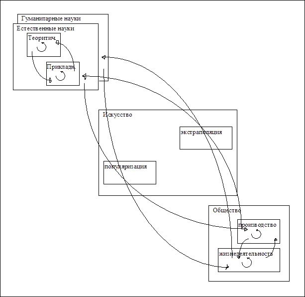Рисунок 2 Рисунок 2 представляет собой очень общую схему, работать с которой практически невозможно, поэтому необходимо несколько расширить его. Наука, в общем случае, подразделяется на естественную и гуманитарную, которые в свою очередь делятся на прикладную и теоретическую. Каждое из этих направлений развивается само по себе, с одной стороны, и задает направление к развитию для другой стороны. Также имеет место попытка проникновения естественных наук в сферу гуманитарных и наоборот. Такие процессы происходят внутри объекта «наука». Процессы, происходящие в обществе можно условно разделить на два основных, которые нам и нужны, - это процесс производства и процесс жизнедеятельности людей. Здесь, точно так же как и в предыдущем случае, каждый из подобъектов, развиваясь сам по себе, задает направление для другой стороны. У искусства так же имеется две основные составляющие, которые необходимы для рассмотрения нашей задачи: это популяризация и экстраполяция, посредством которых происходит связь науки и общества. Причем в основном связь происходит по следующим парам: à естественные науки -> производство, à производство -> Естественные науки, à гуманитарные науки -> жизнедеятельность, à жизнедеятельность -> Гуманитарные науки, это в случае если из связки выбросить искусство, вместе с ним мы получим следующие связки: à естественные науки ->популяризация -> производство, à производство -> экстраполяция -> Естественные науки, à гуманитарные науки -> популяризация -> жизнедеятельность, à жизнедеятельность -> экстраполяция -> Гуманитарные науки. (Конечно же, надо учитывать, что в чистом виде такие связки встретить можно редко, гораздо чаще в литературных произведениях функции популяризации и экстраполяции идут рядом.) Если связать все воедино, то получается схема, представленная на рисунке 3.