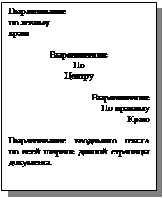 Программа Microsoft Word 97 позволяет для каждого шрифта задавать следующие преобразования: · наклонять буквы (курсив) ; · увеличивать толщину букв (жирность) ; · делать одинарное или двойное подчеркивание. В своем Бизнес – Плане студенческая компания «ОЛИМП» использовала строгий официальный шрифт Times New Roman, размер 14 (этот же шрифт используется как основной в данной работе ). В прил. 1 мы видим, что заголовок данного фрагмента написан другим шрифтом (Arial, размер12, жирный курсив), заголовки второго уровня подчеркнуты, а заголовки третьего уровня заданны жирным курсивом. Возможности изменения размеров шрифта можно рассмотреть в приложении 2 . Данная страница является титульным листом Документа. Название учебного заведения (МЛРАН) здесь написано прописными буквами шрифта Times New Roman размером 12, строка «БИЗНЕС – ПЛАН» - размером 48, а все остальное (за исключением логотипа, который является графическим объектом – см. гл. Вставки ) - размером 14. Изменение начертания и размеров шрифта можно осуществлять с помощью панели инструментов (в верхней части экрана) либо в диалоговом окне Формат\Шрифт. Здесь же можно задать цвет букв (для электронного документа или цветного принтера) и некоторые другие преобразования шрифта. Вкладка Интервал позволят изменять интервал между символами в тексте, а вкладка Анимация поможет сделать электронный документ (хранящийся на компьютере и создающийся без цели распечатки) более интересным и привлекательным. Для того чтобы документ выглядел эстетично и, где это необходимо, симметрично, нужно задать соответствующее выравнивание текста. Текстовый редактор Microsoft Word 97 позволяет делать несколько видов выравнивания текста (см. пример 2): · по левому краю страницы; · по центру страницы; · по правому краю страницы; · по всей ширине страницы.