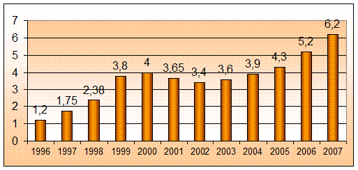 Цель исследования: описание основных тенденций развития российского косметического рынка за последние 3 года (2005 - 2008). 1. исследовать общеотраслевые тенденции косметического рынка: - описать рынок (емкость рынка, насыщенность рынка). - описать товары представленные на рынке - описать динамику изменения спроса на продукцию за последние 3 года. - описать потребительские сегменты рынка 2. исследовать уровень конкурентной среды - выявить основных игроков российского рынка (описать их по параметрам товарной политики, ценовой политики, коммуникационной политики, сбытовой политики) - выделить конкурентные преимущества каждого игрока на рынке 3. сделать выводы по тенденциям развития косметического российского рынка 1. Исследование общеотраслевых тенденций. 1.1 Описание рынка Парфюмерно-косметический рынок России - один из наиболее развивающихся в мире. Темпы его роста в среднем составляют 10-15%. Это один из крупнейших потребительских рынков Европы. Многие аналитики отмечают, что сегодня российский парфюмерно-косметический рынок является чрезвычайно привлекательным для иностранцев. Москва становится для западных компаний «окном в Россию». То, что происходит в столице сейчас, через несколько лет повторится в других городах страны. Рост благосостояния российского населения естественным образом сказывается на объемах текущего, повседневного потребления. До последнего времени российский рынок парфюмерно-косметической продукции переживал настоящий бум. Его объем оценивается в 6 млрд. долларов, а среднегодовые темпы роста еще недавно составляли 10-15%. Рис.1. Динамика объемов российского парфюмерно-косметического рынка в 1996-2007 гг., $ млрд. Источник: «Старая крепость», Верб Ф. Реставрация люкса // Компания. 2007, №2; Оценки показателей роста рынка парфюмерии и косметики от разных маркетинговых агентств и экспертов демонстрируют значительные расхождения. Главной причиной этому является, по всей видимости, сохранение существенного «пласта» теневого рынка, который не поддается точным оценкам ни официальной статистики, ни экспертного сообщества. За последние 5 лет рост продаж косметики и парфюмерии в России ежегодно увеличивался на 15-20%, а предельную емкость отечественного рынка эксперты оценивают в $15-18 млрд На сегодняшний день темпы роста рынка уже снижаются, и в дальнейшем, по некоторым оценкам, могут снизиться до 1-5% в год. По некоторым прогнозам, уже в текущем 2008 году рост парфюмерно-косметического рынка сократится с привычных 15% до 5%[1] . Соответственно, российский рынок приближается к тому, чтобы развиваться по общемировому сценарию. Снижение темпов роста обусловлено естественными причинами. Главная заключается в том, что спрос на качественную косметику, стартовавший в начале 90-х, сейчас практически удовлетворен, а потребительский потенциал реализован – даже нынешний рост доходов не позволяет населению продолжать увеличивать траты на косметику. Таким образом, потенциал российского рынка пока еще далеко не реализован полностью. Россияне расходуют на эти цели в пять раз меньше, чем жители других европейских стран: по данным компании «КОМКОН Груп», в бюджете российских женщин расходы на косметику занимают порядка 12%[2] . Однако даже самые скромные оценки роста российского рынка парфюмерии и косметики все равно больше, чем те же показа