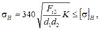 b 2 = 0,355aw = 0,355×125 = 44,4 мм, округляем до значения из ряда нормальных размеров b 2 = 45 мм; условный угол обхвата червяка венцом колеса 2d = 2×arcsin(b 2 /(da 1 – 0,5m )) = 2×arcsin(45/(63 – 0,5×6,3)) = 98°. Определим силы в зацеплении окружная сила на колесе, равная осевой силе на червяке Ft 2 = Fa 1 = 2000T 2 /d 2 = 2000×339/201,6 = 3363 Н; окружная сила на червяке, равная осевой силе на колесе Ft 1 = Fa 2 = 2000T 2 /(u ф d 1 ) = 2000×339/(16×50,4) = 841 Н; радиальная сила, раздвигающая червяк и колесо Fr = Ft 2 tg20° = 3363×0,364 = 1224 Н. 2.4 Проверочный расчёт червячной передачи Фактическая скорость скольжения vS = u ф w2 d 1 /(2cosg×103 ) = 16×9,4×50,4/(2×cos14,04°×103 ) = 3,91 м/с. Определим коэффициент полезного действия передачи h = tgg/tg(g + j) = tg14,04°/tg(14,04 + 2,5)° = 0,84, где j – угол трения, зависящий от фактической скорости скольжения, град. Проверим контактные напряжения зубьев колеса