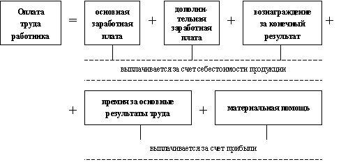 где: С — стоимость продукции; М — стоимость материалов и сырья; А — амортизационные отчисления; З — основная и дополнительная заработная плата; О — обязательные отчисления от заработной платы; Н — накладные расходы; П — прибыль. Структура оплаты труда позволяет определить, какие составляющие входят в оплату труда работника, в каких статьях себестоимости и прибыли они отражаются, каков удельный вес конкретного элемента в общей величине, заработной платы (рис.1.).