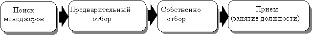 Рис. 2. Схема процесса формирования руководящих кадров Поиск менеджеров Обычно менеджеров находят среди сотрудников фирмы, что в большинстве случаев является лучшим решением по очевидным причинам. При поиске управляющих со стороны пользуются следующими методами: - непосредственное обращение к определенным лицам с предложением занять должность (обычно это касается менеджеров высшего звена); Предварительный отбор. Претенденты на занятие должности, как правило, заполняют специальные анкеты, где указывают все интересующие фирму данные о себе. По анкетным данным и предварительным беседам производится: - отсев неудовлетворяющих фирму лиц (по возрасту, образованию и т.д.); Собственно отбор: - психологический тест (логика, анализ, концентрация внимания); 4. Содержание работы руководителя Всю работу по управлению можно разделить на две части: - управление деятельностью фирмы;