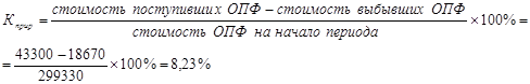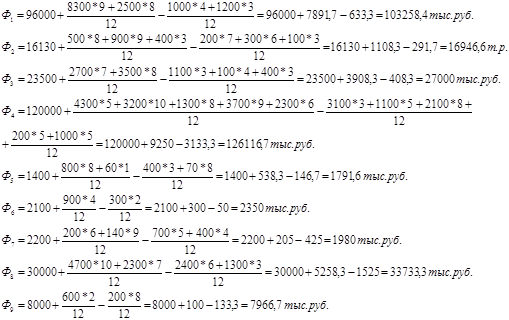 где Фн – стоимость основных фондов на начало года; Фв – стоимость основных фондов, введенных в течение года; Фл – стоимость основных фондов, выбывших в течение года; Тв – время (мес) функционирования основных фондов, введенных в течение года; Тл – время (мес), прошедшее после выбытия основных фондов в течение года.