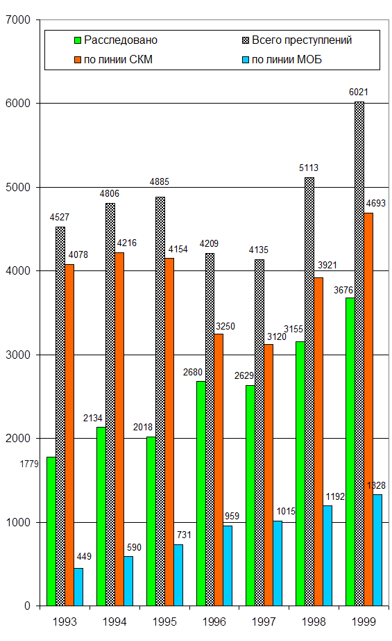 Анализ практики работа УВД города Березники Пермской области, начальником которого я являюсь, по распределению должностных обязанностей по контролю, показал, что имеется ряд недостатков в этом направлении. К наиболее общим из них относятся: неконкретность должностных обязанностей, их нерациональное распределение, что в итоге отражается на организации и контроле за работой, по выполнению основных функций, раскрытию преступлений, особенно на уровне среднего звена управления - руководителей подразделений и конкретных исполнителей. Для устранения указанных недостатков необходимо: - провести тщательный анализ деятельности каждого руководителя среднего звена и сотрудников подразделений с учетом научно-практического анализа вышестоящих органов в этом направлении; - внести изменения в должностные инструкции, конкретизировать должностные обязанности каждого сотрудника по выполняемой им работе; - отработать практически четкую систему организации работы по схеме «инструктаж - контроль - подведение итогов». ХАРАКТЕРИСТИКА УВД г. БЕРЕЗНИКИ И АНАЛИЗ ОПЕРАТИВНОЙ ОБСТАНОВКИ Штатная численность личного состава составляет 839 человек аттестованного состава, из них штатная численность ОВО при УВД 113 человек. За счет средств федерального бюджета содержится 360 человек, за счет средств местного бюджета 479 человек. Милиция общественной безопасности составляет 361 человек (без ОВО), криминальная милиция 77 человек. Следственный отдел УВД совместно с ЭКО 75 человек. УВД в своей структуре, кроме подразделений, входящих в криминальную милицию, милицию общественной безопасности, ОВО, следственного отдела с ЭКО, штаба УВД, подразделения тылового обеспечения, имеет отдел милиции, обслуживающий северо-восточную часть города с населением 78,6 тыс. чел. Данное подразделение имеет свою дежурную часть, починяющуюся в своей деятельности дежурной части УВД г. Березники. Оперативная обстановка Личный состав УВД г. Березники строит свою работу в соответствии с требованиями Директив Министра внутренних дел РФ № 1 - 96 г., № 1дсп-99г., приказа МВД № 145 от 20.03.96 г. «О концепции развития органов внутренних дел и внутренних войск МВД России», других нормативно-правовых актов МВД РФ, УВД Пермской области, администрации Пермской области, органов местного самоуправления. Анализируя состояние преступности на обслуживаемой территории с 1993 по 1999 года, следует отметить тенденцию неуклонного роста преступности с 1993 по 1995 годы, и только конкретные принимаемые меры позволили снизить преступность в 1997 году на 1,7 %. Отмечено снижение убийств на 3 %, причинение тяжкого вреда здоровью на 18,2 %, изнасилований на 10 %. Принятые конкретные меры позволили снизить преступность в общественных местах на 17,4 %, в том числе на улице на 13,9 %. Раскрываемость составила 61,4 %. В течение 1999 г. оперативная обстановка оставалась сложной. Рост преступности составил 17,7 % по сравнению с 1998 годом. Раскрываемость – 59,7 %. Снижение: изнасилований на 6,7 %, хулиганств на 5,7 %, вымогательств на 33,3 %. Следует однако отметить, что тяжкие преступления занимают ведущее место в структуре преступности, их удельный вес – 68,9 %. Рост убийств на 37 %, грабежей на 37,7 %, разбойных нападений на 36,7 %, краж на 28,6 %, краж из квартир на 76,6 %. Удельный вес преступлений по линии милиции общественной безопасности составил – 22,1 % (снижение на 1