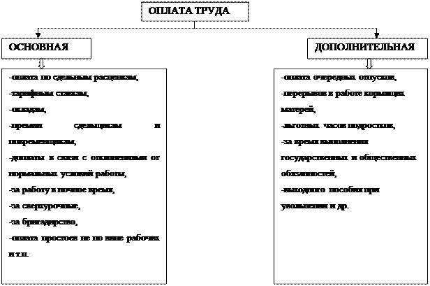 Рисунок 2 – Формы оплаты труда Первые две формы оплаты труда имеют свои системы: - простая повременная (заработок рабочих определяют умножением часовой или дневной тарифной ставки его разряда на количество отработанных им часов или дней); -повременно-премиальная (к сумме заработка по тарифу прибавляют премию в определенном проценте к тарифной ставке или к другому измерителю); -прямая сдельная (оплата осуществляется за число единиц изготовленной ими продукции и выполненных работ исходя из твердых сдельных расценок, установленных с учетом необходимой квалификации); -сдельно-премиальная (оплата предусматривает премирование за перевыполнение норм выработки и достижение определенных качественных показателей (отсутствие брака, рекламации и т.п.)); -сдельно-прогрессивная (оплата повышается за выработку сверх нормы); -косвенно-сдельная (оплата труда наладчиков, комплектовщиков, помощников мастеров и других рабочих осуществляется в процентах к заработку основных рабочих обслуживаемого участка). Первичными документами по учету труда работников при повременной оплате являются табели. Расчет заработка при сдельной форме оплаты труда осуществляется по документам о выработке. Для более полного учета трудового вклада каждого рабочего в результаты труда бригады с согласия ее членов могут использоваться коэффициенты трудового участия (КТУ). Для правильного начисления оплаты труда рабочим большое значение имеет учет отступлений от нормальных условий работы, которые требуют дополнительных затрат труда и оплачиваются дополнительно к действующим расценкам на сдельную работу. Размеры доплат и условия их выплаты предприятия устанавливают самостоятельно и фиксируют их в коллективном договоре (положение об оплате труда). При этом размеры доплат не могут быть ниже установленных законодательством. Брак, возникший не по вине работника, оплачивается по пониженным расценкам. Месячная заработная плата работника в этом случае не может быть ниже 2/3 от тарифной ставки установленного ему разряда (оклада). Брак, который произошел вследствие скрытого дефекта в обрабатываемых материалах, а также брак не по вине работника, обнаруженный после приемки изделия органами технического контроля, оплачивается работнику наравне с годными изделиями. Час ночной работы (с 22 до 6 ч) оплачивается в повышенном размере, предусмотренном коллективным договором организации, но не ниже размеров, установленных законодательством. Продолжительность ночной работы (смены) сокращается на 1 ч. Сверхурочные работы допускаются в исключительных случаях и с разрешения профкома организации. Работа в сверхурочное время оплачивается за первые два часа не менее чем в полуторном размере, а за последующие часы — не менее чем в двойном размере за каждый час сверхурочной работы. Сверхурочные работы не должны превышать для каждого работника четырех часов в течение двух дней подряд и 120 ч в год. Компенсация сверхурочных часов отгулом не допускается. К сверхурочным работам и к работе в ночное время не допускаются беременные женщины и женщины, имеющие детей в возрасте до трех лет, работники моложе 18 лет, работники других категорий, установленных законодательством. Работа в выходные и праздничные дни компенсируется работнику предоставлением другого дня отдыха или, по соглашен