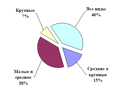 2. Рынок лизинговых услуг 2.1 Клиенты Для понимания роли лизинга, необходимо рассмотреть практику инвестиционной деятельности в России. Самым главным источником финансирования приобретения оборудования в России является нераспределенная прибыль, за которой следует собственный капитал. Кредитный рынок не в состоянии финансировать огромные потребности в капитале. Несмотря на такое положение дел, инвестиции в России оцениваются на уровне 18% от ВВП, по сравнению с 10%-15%, присущими странам ОЭСР. Для малых и средних предприятий возможность использовать только собственный капитал является особенно большой проблемой. Однако банковское кредитование также далеко не всегда доступно или целесообразно для предприятий. Основным препятствием для развития компаний является нехватка банковских кредитов на сроки более длительные, чем один год. Кроме того, требования банков по погашению кредитов, дополнительному обеспечению и прочим условиям значительно более жесткие, чем требования лизингодателей. Лизинговые компании в большинстве случаев (обычно за исключением работы с малым бизнесом) рассматривают лизинг как форму проектного финансирования, больше рассчитывая на доходы, генерируемые самим объектом лизинга, чем на другие доходы компании. Это обуславливает более гибкий подход и к обеспечению лизинговых сделок, и к графикам платежей. Характер клиентской базы лизинговой компании обусловлен, главным образом, целями ее деятельности, которые в свою очередь определяются, прежде всего, типом учредителей компании (см. рис 1). Рис. 1 Лизинговые компании по размерам лизингополучателей. [3] Это подтверждают и данные опроса МФК, говорящие о том, что поиск клиентов российскими лизинговыми компаниями осуществляется через контакты учредителей (79%). Лишь 53% опрошенных МФК компаний используют рекламу. Лизинговые компании, участвовавшие в опросе МФК, работают в основном с малыми и средними предприятиями. Только 7% из опрошенных компаний работает исключительно с крупными предприятиями. Клиентами 38% компаний являются малые и средние предприятия, а 40% работают со всеми видами предприятий