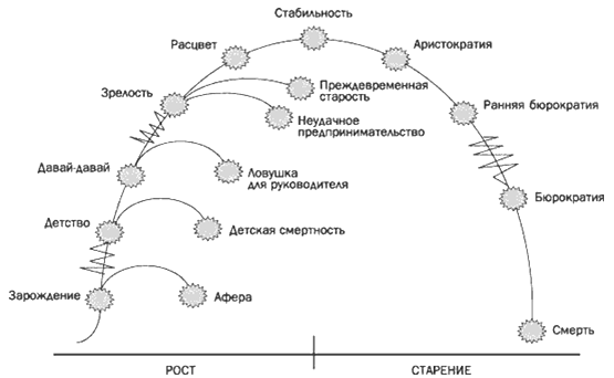 Прежде чем характеризовать отдельные стадии жизненного цикла, приведем ряд соображений по поводу данного графика. Не существует четких индикаторов перехода от одной стадии к другой. Длительность стадий четко не определяется. В каждой организации она может быть своей. Более того, длительность каждой стадии зависит от актуального уровня развития экономики той или иной страны. Факт то, что рано или поздно организация проходит все эти стадии (но, вполне возможно, не при жизни одного поколения людей). С достаточной степенью условности стадии жизненного цикла можно сгруппировать в два больших этапа — этап роста и этап старения: этап роста характеризуется преобладанием гибкости над контролируемостью; на этапе старения — наоборот, контролируемость преобладает над гибкостью. Характеристика стадий жизненного цикла организации I. Выхаживание Организации еще нет физически, но есть бизнес-идея и энтузиазм основателя или основателей. Происходят обсуждения, прорабатывается миссия, оценивается рынок. У предпринимателя есть ориентация на продукт, но пока слабо представима потребность рынка в этом продукте. Эту стадию можно считать завершенной и организация перейдет на следующую стадию, если предприниматель поверил в идею, готов взять на себя риск нового дела и может найти финансовую поддержку. II. Младенчество В организации гибкая, но нечеткая структура, маленький бюджет, слаба система правил и процедур ведения дела. Персонификация персонала. Слабая субординация, иерархия слабо выражена. Каждое решение — новое, создающее прецеденты. Управление происходит рефлекторно — от кризиса к кризису. Стратегия компании определяется в большей степени внешними воздействиями (рынком, клиентами и т.д.) Условия выживания на этой стадии и перехода к следующей: стабилизация денежных поступлений; преданность идее построения устойчивой организации. III. Детство Эту стадию называют еще стадией быстрого роста или стадией «давай-давай» (go-go). Это стадия, когда забываются трудности и создается впечатление о безоблачности дальнейшего пути. Появляется склонность к неоправданной диверсификации и «влезанию» в новые сферы бизнеса. Появляется формальная организационная структура, но нет пока строгих должностных обязанностей, развито совмещение и пересечение функций. Предприниматель (основатель, владелец) пытается делегировать полномочия, но опасается потерять контроль над делом и сотрудниками. Организация действует методом проб и ошибок, не может предвидеть изменения во внешней среде, что приводит к потерям и кризисам. Главное условие избежания краха на данной стадии: создание профессиональной административной подсистемы. IV. Юность Это кризисный период, аналог переходного возраста у людей. Дело перерастает возможности предпринимателя (основателей) и его энтузиазма становится мало. Типичные варианты решения этой проблемы — децентрализация, делегирование полномочий, принятие на работу профессиональных менеджеров, которые меняют всю систему управления организацией. Это, правда, приводит к конфликтам между старыми и новыми сотрудниками, между профессиональными менеджерами и отцами-основателями, подразделениями и отдельными сотрудниками. На этой стадии укрепляется организационная культура, растет эффективность административных процедур и у
