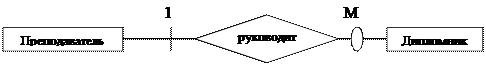 Рисунок 3.3 – Сущность – связь «Преподаватель– Аспирант». Так как аспирант должен обязательно работать под руководством преподавателя, то сущность «Аспирант» имеет обязательный класс принадлежности. Но преподаватель может не руководить не одним из аспирантов, поэтому сущность «Преподаватель» имеет необязательный класс принадлежности. Преподаватель – Предмет . Один предмет читается только одним преподавателем, но один преподаватель может читать несколько предметов, поэтому тип связи «Преподаватель – Предмет» один-ко-многим (рисунок 3.4).