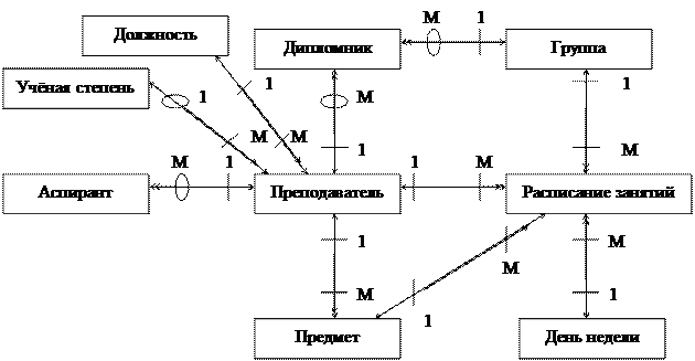 Рисунок 3.8 – Сущность – связь «Преподаватель – Расписание занятий». Так как день недели обязательно должен ставиться в расписании занятий, то сущность «День недели» имеет обязательный класс принадлежности. Расписание занятий обязательно должно содержать день недели, поэтому «Расписание занятий» тоже имеет обязательный класс принадлежности.