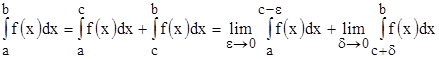В последнем случае несобственный интеграл существует (или сходится), если сходятся оба интеграла. Так же как и несобственный интеграл с бесконечными пределами, данный интеграл тоже не является пределом Как и в предыдущем параграфе, рассмотрим пример, используемый при решении других задач.