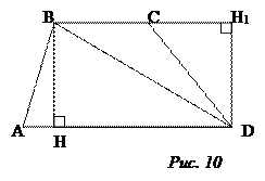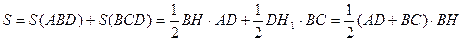 имеют равные площади, так как любые два из этих треугольников, которые имеют общую сторону, имеют равные основания и общую высоту, следовательно, 2.5 Площадь трапеции Условимся высотой трапеции называть перпендикуляр, проведенный из любой точки одного из оснований к прямой, содержащей другое основание. Теорема 8 . Площадь трапеции равна произведению полусуммы ее оснований на высоту. ○ Пусть S – площадь трапеции ABCD