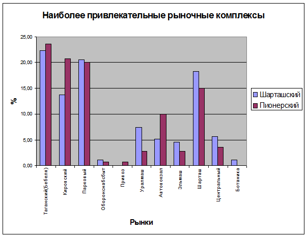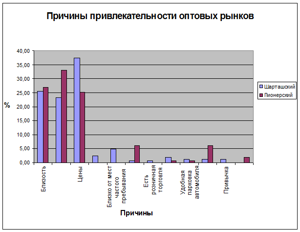 Диаграмма №1 Как видно из диаграммы, наиболее популярные рынки это Таганский ряд и Парковый. В обоих опрашиваемых районах эти рынки назвало примерно 22%. Это обусловлено тем, что Таганский и Парковый рынки давно действуют на территории города и хорошо известны потребителям. На Таганском ряду большой вещевой ассортимент, а Парковый рынок характеризуется большим разнообразием продуктовой группы. Следующими по привлекательности идут Кировский и Шарташский рынки. Кировский рынок больше предпочитают жители Пионерского района (20%), у населения Шарташского района этот показатель около 14%. С Шарташским рынком ситуация обратная: Парковый – около 20%, Пионерский – 15%. В данном случае при выборе рынка жители исследуемых районов руководствовались близостью рынка к месту проживания: Шарташский рынок находится в Шарташском районе, а Кировский к Пионерскому посёлку. По результатам парного распределения видно, что привлекательность рынков среди потребителей в зависимости от их уровня дохода выглядит следующим образом: среди самых низкооплачиваемых слоёв населения (менее 3 тыс. руб. в месяц) наибольшей популярностью пользуются Парковый и Шарташский рынки (по 25% каждый), а среди самых богатых (более 15 тыс. руб. в месяц), наибольшее предпочтение отдаётся Таганскому ряду (47%) и Кировскому (29,5%). Причины привлекательности Анализ ответов на вопрос о причинах привлекательности показал, что население обоих районов основными критериями при отборе рынков считают: близость к месту жительства, разнообразие ассортимента и уровень цен, что отражено на диаграмме №2: Диаграмма №2